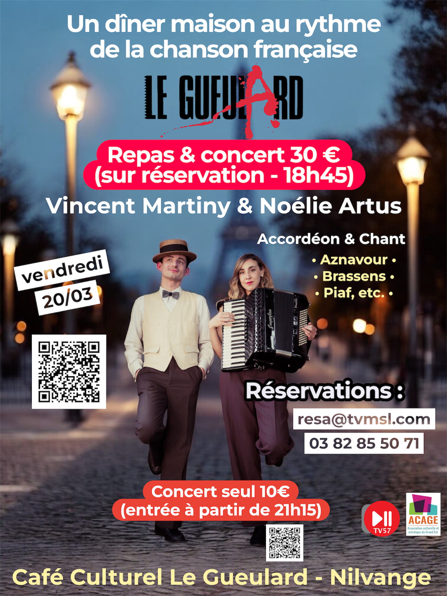 Plongez dans l’ambiance chaleureuse des bistrots parisiens le temps d’une soirée conviviale 🍷🥖 Un duo accordéon & chant vous fera voyager au son des grands classiques de Piaf, Brassens, Aznavour et bien d’autres… 🍽️ Repas maison & concert – 30 € (sur réservation) ⚠️ Places limitées – déjà 20 % vendues ! 🎶 Grand concert ouvert à tous à partir de 21h15 🎟️ Concert seul : 10 € 👉 Réservez vos places en ligne : 🔗 https://tv57.sumupstore.com/.../entree-diner-concert-du... 📌 Infos & réservations : 📧 resa@tvmsl.com | 📞 03 82 85 50 71 Ambiance bistrot, cuisine maison et chansons intemporelles… ✨ Pensez à réserver rapidement, les places repas sont limitées ! 🎶